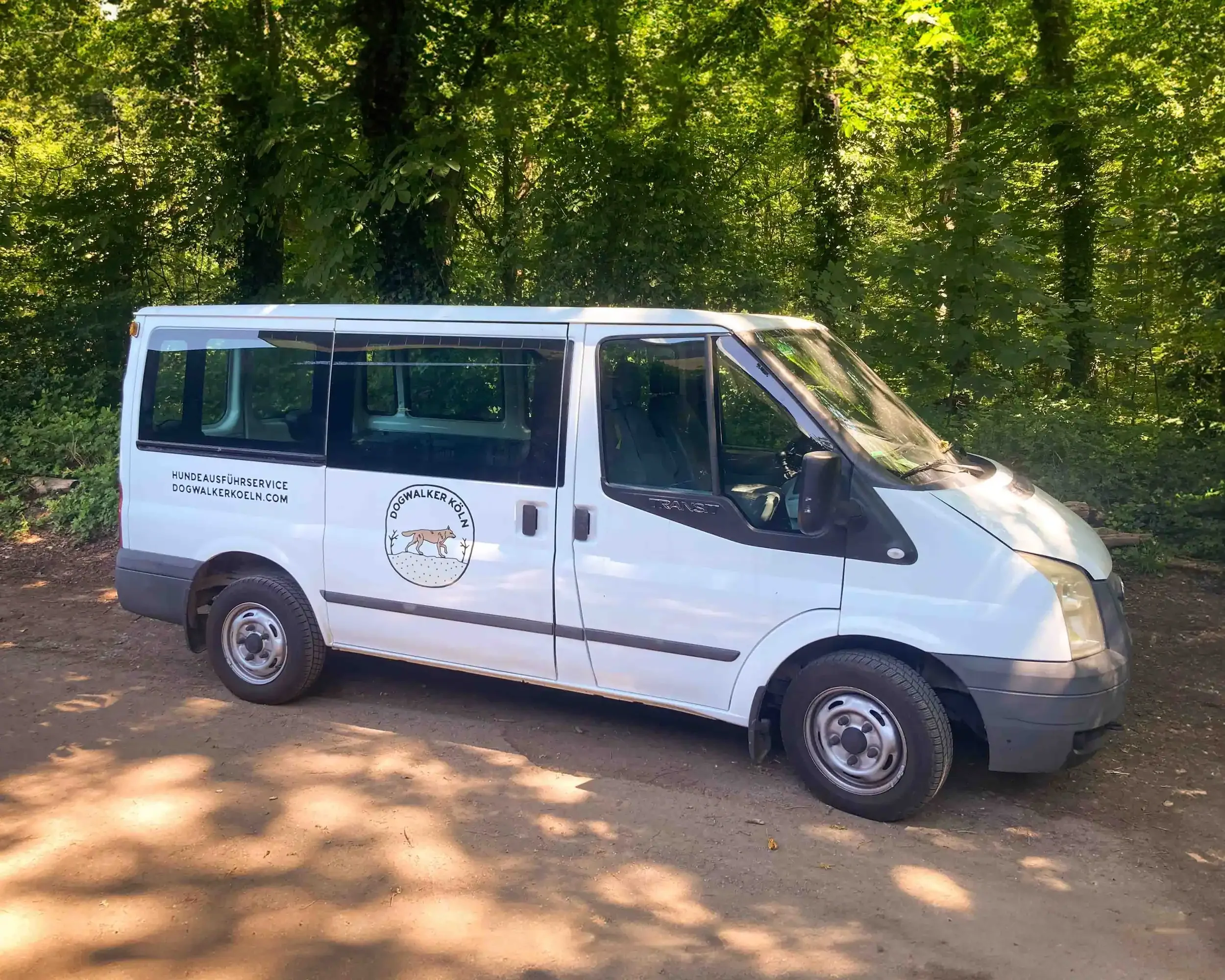 Wir bewegen uns mit meinem Ford Transit, der mit einer Klimaanlage und Hundeboxen ausgestattet ist.